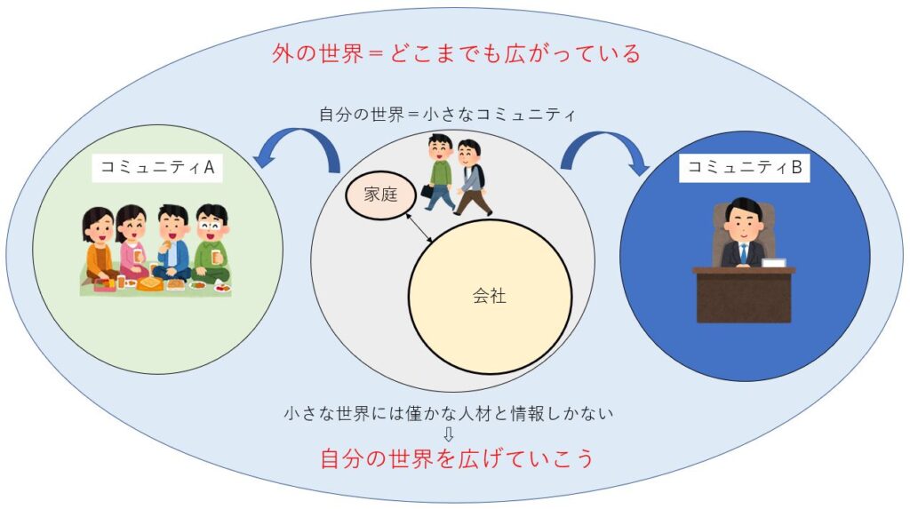 もちろんすべてのサラリーマンがそういうわけではありませんが、本業以外なにもやってなくてコミュニティにも所属していないサラリーマンがつながれる人間、持っている知識・情報には限界があるのも事実です。(営業職とかで仕事柄いろんな人と付き合いがある人なら分かりませんが)