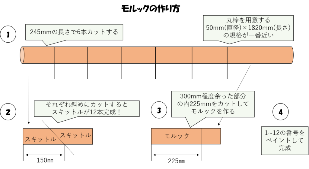 また購入できないくらいでモルックをやりたいという気持ちを諦めないでほしいという意味も込めて自作する道も示してます。