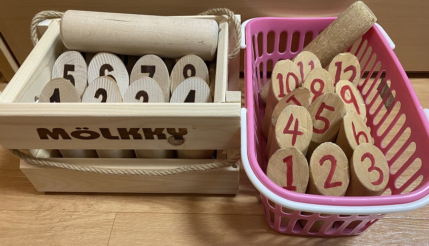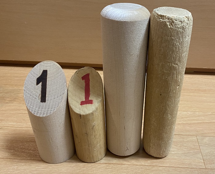 ちなみに写真のモルックは左が正規品と呼ばれるもので右は私が自作したものです。もちろんどちらでも出来ますが、この違いについては後で説明します。