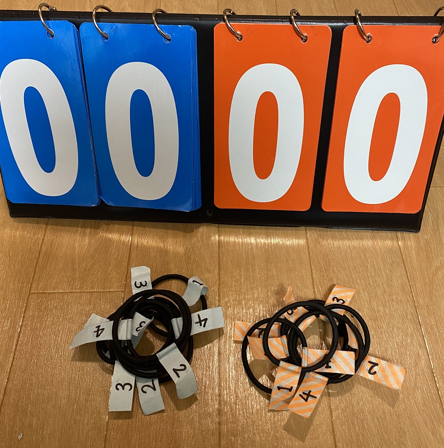しかし、ビブスまで買うとなるとかなりのお値段になるので、私の場合はこんな感じに得点板の色に対応した腕輪を作って把握してます。(100均行って200~300円あれば作れます)