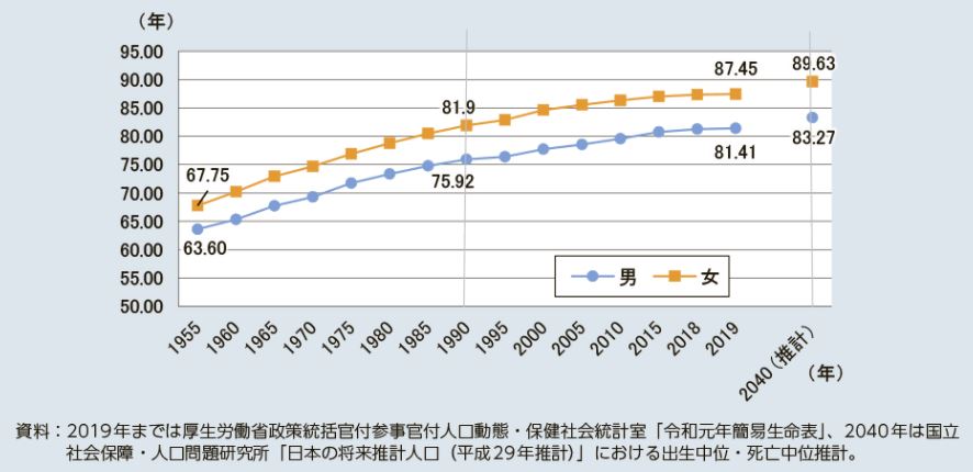 2019年の時点で男性が81.41歳、女性が87.45歳となっています。