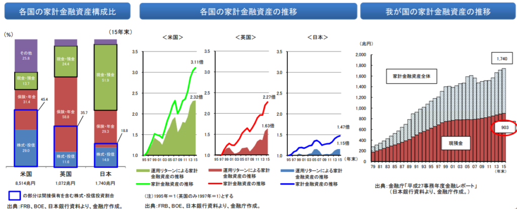 ここで注目したいのは左図の米・英・日の投資割合が真ん中の図の家計金融資産の伸びと比例しているという事実です。